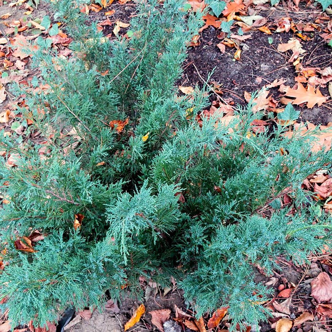 Можжевельник Pfitzeriana Glauca - гибридное происхождение подтверждено генетическим анализом. Крона сплющенная, неправильных очертаний, 1,2-1,8 м высоты и 1,8-2,5 м ширины. Ветки горизонтальные и приподнимающиеся, ориентированы в разных направлениях. Хвоя двух типов, в основном игловидная, сизовато-зеленая, зимой с пурпуровым оттенком.