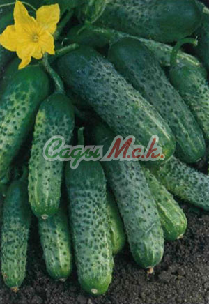 Партенокарпический гибрид для выращивания в условиях квартиры, лоджии и загородного участка в больших емкостях (диаметром 90-100 см), используя поддерживающие вертикальные конструкции. Раннеспелый (53-56 дн от посева), салатный. Растение с ограниченным боковым ветвлением, смешанного типа цветения. Плоды темно-зеленого цвета, редкобугорчатые, цилиндрические, длиной до 20 см. Первые плоды формируются уже за 2-3-м листом центрального побега. Мякоть плотная, с маленькой семенной камерой, вкусная, хрустящая. Кожура без горечи.