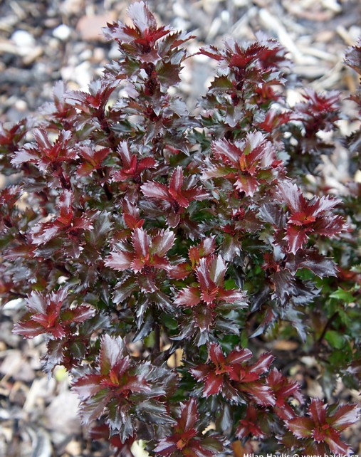 Вечнозеленый высокодекоративный кустарник. Листья зубчатые, волнистые, красно-зеленые. Цветки белые.