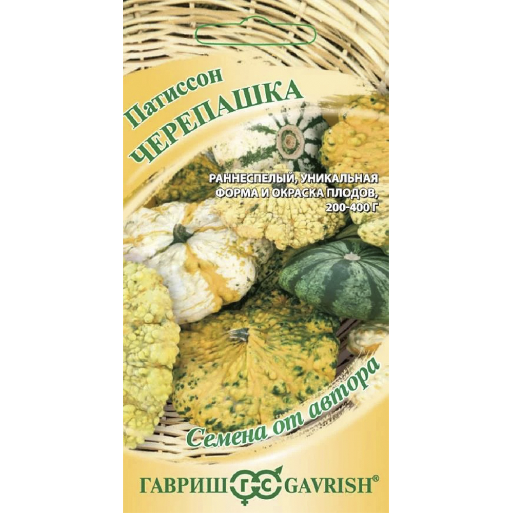 Сорт Черепашка представляет собой смесь уникальных форм и окрасок, не повторяющих друг друга. Плодоносить начинает на 37-43 день. Растение полуплетистое, со слабым ветвлением (даже при перекорме не образует длинных плетей). Одновременно на растение может развиваться до 5 плодов. Плод дисковидный, желобки мелкие, различных окрасок, слаборебристый с боровками среднего размера, массой 0,2–0,4 кг. Мякоть кремовая, плотная, толстая, дольше сохраняет сочность и аромат, чем другие сорта патиссонов. Обладает собственным выраженным, насыщенным вкусом. Используют в домашней кулинарии: молодые завязи для салатов и консервирования, запекания и порционного фарширования. Чем крупнее становится патиссон, тем сильнее грубеет его кожица. Такие экземпляры могут пригодиться для декорирования помещения. Товарная урожайность 3,8–4,1 кг/м². Выращивают посевом в открытый грунт или рассадным способом. Требует плодородной почвы и регулярного полива.