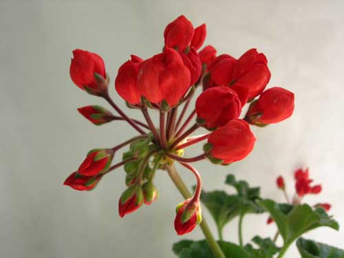 Пеларгония Conny - карликовый компактный кустарник. Листья ажурные, сочные, зеленые, слегка бархатистые. Сорт отличается крупными насыщенно-красными цветками, которые не открываются и до конца цветения остаются бутонами. Цветоносы высокие, бордово-коричневые.
