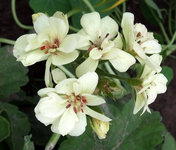 Пеларгония French Vanilla - компактный кустарник. Высота взрослого растения составляет всего 35 см. Листья крупные, темно-зеленые с зубчатыми краями. Цветки махровые, кремово-белые, ванильные или желтоватые, лепестки однотонные. Соцветия плотные. Цветет сорт обильно и длительно.