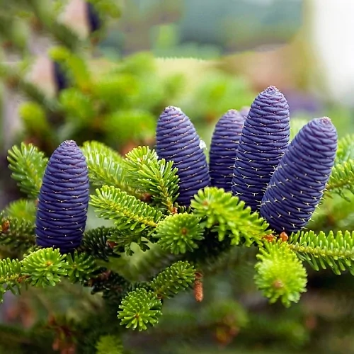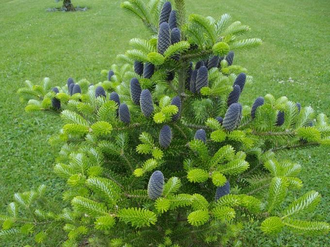 Плоды корейской пихты – шишки пурпурно-фиолетового цвета. Их длина около 4…8 см, диаметр – до 2 см. посажены на ветки вертикально на короткую ножку, концентрируются в верхней частями дерева и на молодых концах веток.