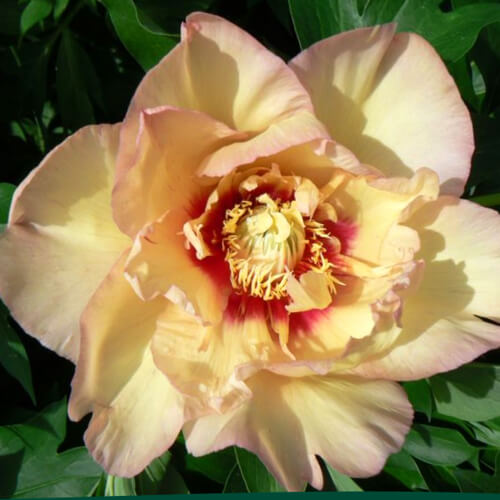 Пион ИТО-гибрид Callie's Memory - крупный персиково-желтый цветок диаметром 15-20 см, с более темной окраской по краю лепестков и каштановым центром. Стебли очень крепкие, имеют 2-3 бутона. Куст крепкий, ровной формы не разрушается под весом крупных цветков.