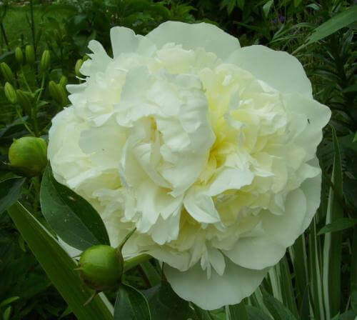 Травянистый пион Duchesse de Nemours образует восхитительные крупные цветы диаметром 15-20 см, белый с желтоватым оттенком и зеленоватым основанием лепестков, постепенно переходит в жемчужно-белый оттенок. Аромат тонкий и сладкий, напоминает запах ландыша. Продолжительность цветения 15-20 дней. Период цветения средне-поздний. Куст раскидистый, достигает в высоту 95-100 см, быстро разрастается и очень обильно цветет. Листья ажурные, рассеченные темно-зеленого оттенка, к осени приобретают багряный цвет.