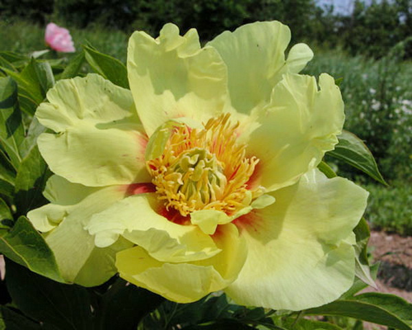 Пион ИТО-гибрид Going Bananas простой формы. Светло-желтый, с светло-красными пятнами в основании. Цветок очень крупный. Диаметр цветка - 22 см. Срок цветения - средний. Высота куста - 70 см.