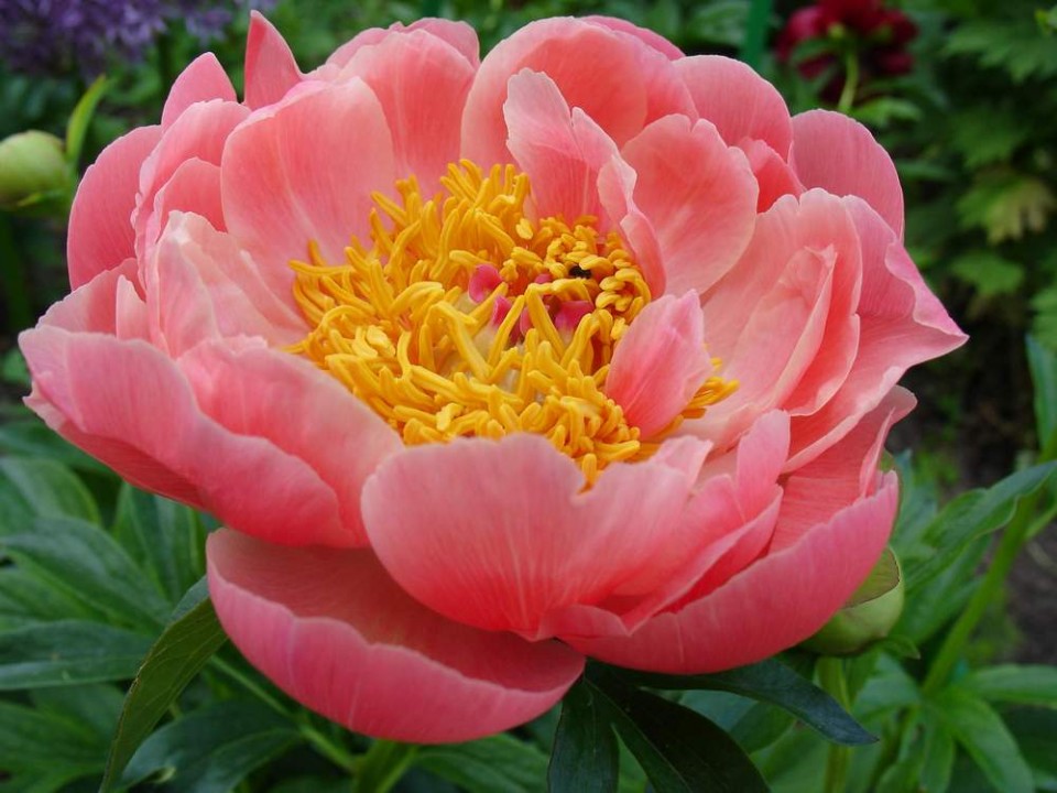 Крупномер пиона Pink Hawaiian Coral, 80 см, отлично развивается в солнечном месте. При посадке необходимо учитывать, чтобы почки располагались не выше 5 см от земли, иначе пионы не будут цвести. Потребуется сухая почва, богатая минеральными компонентами. Особенности сорта: аромат сена, непереносимость плотной почвы.