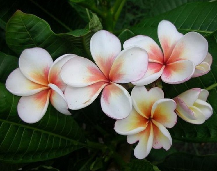 Plumeria Anna Thai - небольшое (2-10 м), красивоцветущее, тропическое деревце с темно-зелеными продолговатыми линейными листьями и ароматными цветами. Может цвести несколько раз в год. Цветки крупные, диаметром 10 см, пятилепестковые, бледно-розовые, с ярким розовым центром.