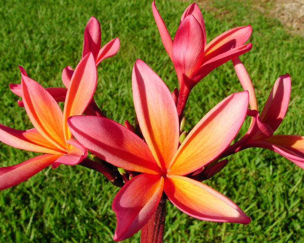 Plumeria Kauka Wilder отличается сильным, сладким ароматом цветков. Цветки простые, средним диаметром 8 см. Лепестки узко-эллиптические с острым окончанием, розово-оранжевого нежного цвета с большим ярко-желтым центром.