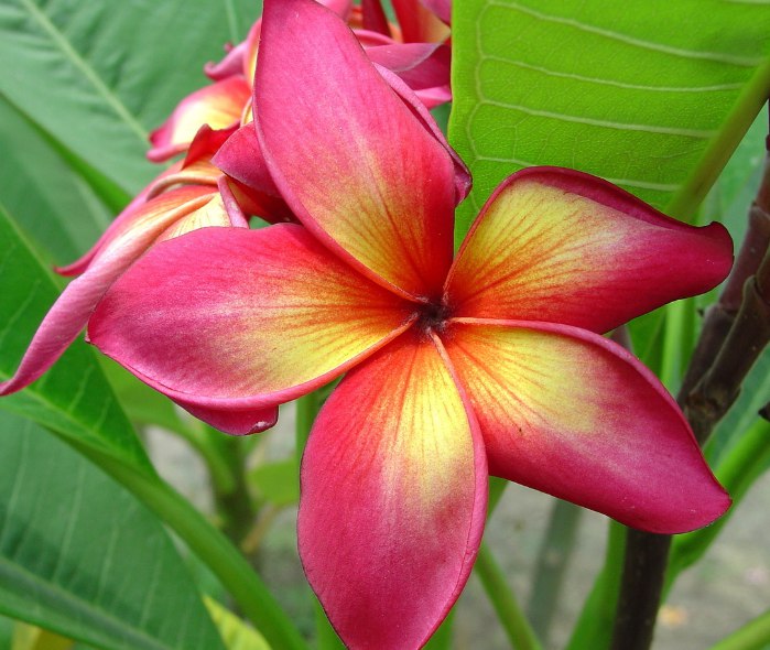Plumeria Mango Brush - великолепный цветочный парфюм. Цветки средних размеров, простые. Лепестки эллиптической формы, слегка заостренные, насыщенно-розовые с желто-красным центром. Средняя длина лепестка - 4 см.