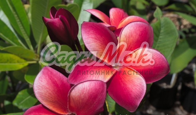Plumeria Pops отличается насыщенно-розовыми, почти однородного окраса цветками. По краям лепестков присутствуют светло-розовые оттенки. Форма лепестков продолговатая, заостренная у кончика. Цветки 5-лепестковые. Молодые ветви бордовые.