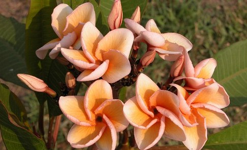 Plumeria Salmon Brown - прекрасное ароматное растение. Деревце маленькое, крепкое. Листья темно-зеленые, крупные. Цветки кремово-оранжево-розовые, с продолговатыми, завернутыми лепестками. Основание цветка оранжево-красное.