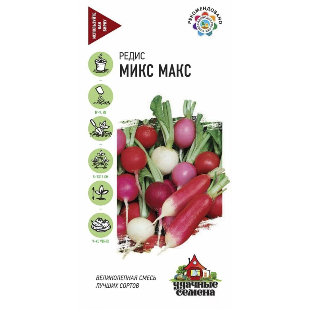 Смесь лучших редисов от компании «Гавриш» — неповторимое разнообразие на вашей грядке! Смесь Микс Макс состоит из сортов Кайман, Лиман, 18 дней, Французский завтрак, Сосулька, Моховский и др. Достоинство ее в том, что в ней присутствуют сорта, быстро набирающие массу и дружно отдающие урожай, и сорта с постепенно нарастающим крупным корнеплодом для многократных сборов.