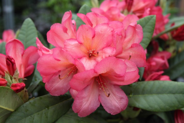 Рододендрон гибридный Balalaika - низкорослый компактный куст, цветение обильное. Высота - 60 см. Цветы оранжево-красные, с красновато-розовыми краями, внутри насыщенно оранжево-желтые, многочисленные по 6-10 в соцветии. Цветение: конец мая-середина июня. Морозоустойчивость: -22 С.