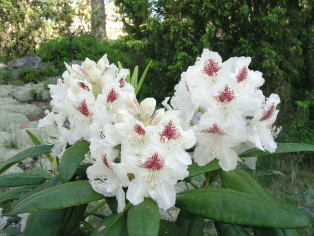 Рододендрон P.M.A. Tigerstedt - сорт вечнозелёных рододендронов гибридного происхождения. За десять лет растение достигает высоты более 1,5 метров. Ширина куста примерно равна высоте. В тени крона становится рыхлой, на светлом месте вырастает в гармонично выглядящий, широкий и высокий куст. Листья вечнозелёные, голые, тёмно-зелёные, 55 мм. Бутоны кремовые. Соцветия конические, несут 14—18 цветков. Цветки воронковидные, около 7 см в диаметре, белые, на верхнем лепестке имеется большое тёмно-фиолетовое пятно. Лепестков 6. Тычинки белые.