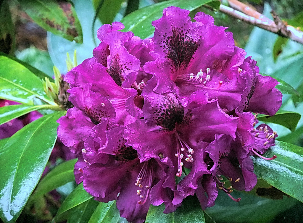 Рододендрон Purple Splendour относится к группе крупноцветные рододендроны. Рост типичный для вида, шаровидный кустарник 1-2 м. Листья вечнозеленые . Окраска цветов фиолетовая с более темным ярким пятном. Время цветения май-июнь. Любит полузатенённое место умеренно влажная почва.