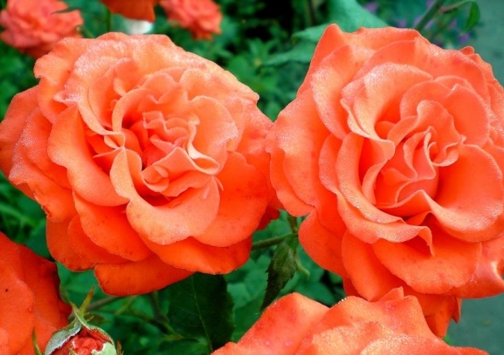 Роза Angelique. - цветки яркие, лососево-оранжевые, светящиеся, ровного тона, благородной формы, крупные (11 —12 см), махровые (45 лепестков), с приятным ароматом, одиночные, на прочных, длинных цветоносах. Листья густо-зеленые, кожистые, полублестящие. Шипы частые, средние и мелкие. Кусты высокие, пряморослые. Цветение умеренное до обильного. Высокодекоративный сорт для выгонки, срезки, групповых посадок.