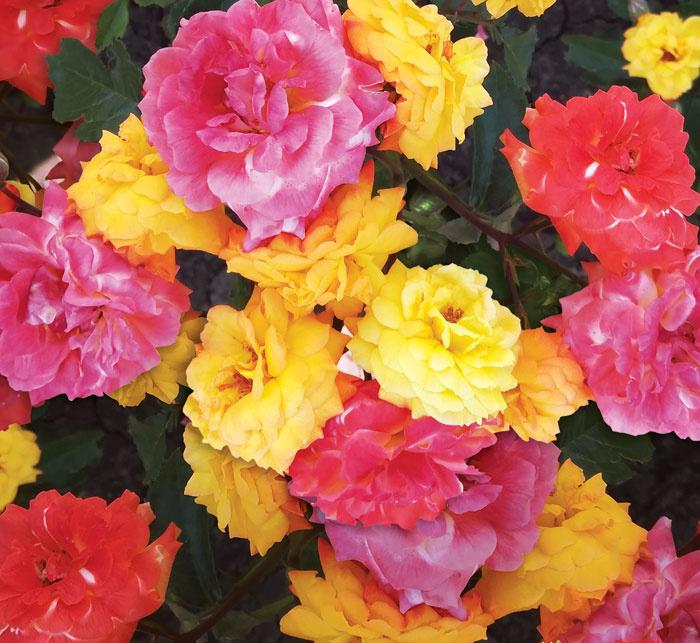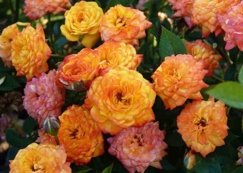 Роза Baby Masquerade - цветки лимонно-хромовой окраски, переходят в розово-красные, чашевидные до открытых, средние (3—4 см), махровые (38—42 лепестков), еле душистые, в соцветиях по 3—12. Листья темно-зеленые, кожистые, блестящие, заостренно-вытянутые. Кусты низкие (20—35 см), компактные, сильно разветвленные. Цветение обильное. Зимостойкий. Устойчив к грибным болезням.