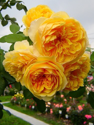 Обычно куст вырастает до 1,2 м в высоту, но в жарких странах этот гигант может достигать 3 м. Дугообразные побеги покрыты темно-зеленой, глянцевой листвой. Крупномер Graham Thomas формирует кисти из 3-5 бутонов. Цветки в диаметре достигают 12 см. Оттенок – ярко-желтый, но в зависимости от погодных условий может приобретать персиковый или красноватый окрас. Аромат цветков насыщенный, стойкий, напоминает чайные розы. Саженцы проявляют среднюю стойкость к болезням и к дождю. Растение принадлежит к повторноцветущим сортам.