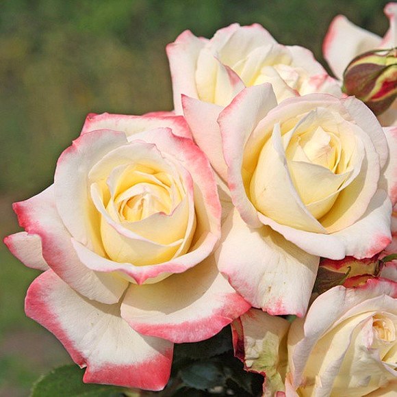 Роза Athena - цветки крупные, кристально белые, с розовыми краями лепестков. У них длинные лепестки и медленно распускающиеся элегантные бутоны. Розы появляются по одной или в небольших кистях (редко более 5 шт), на длинных побегах. .