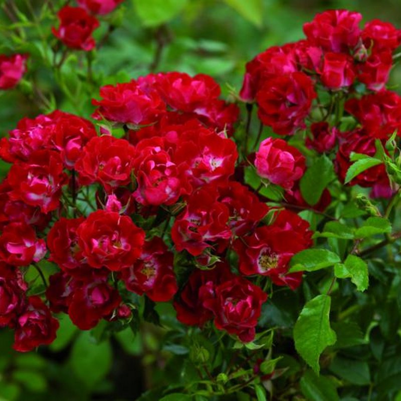 Роза Rambling Rosie цветы полумахровые (9-16 лепестков). Крупные соцветия небольших красных с белым центром цветков усыпают куст во время цветения. Размер цветка 4 см. На стебле есть 5-10 цветков. Куст мощный, высокий, быстро растущий. Высота растения 305-365 см. Листва темно-зеленая, глянцевая, высоко-устойчивая к заболеваниям.