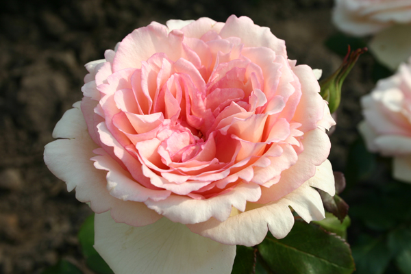 Роза Souvenir de Baden-Baden- крупные (диаметром от 10 см) цветки, густомахровые (60 лепестков в одном цветке), кремово-розовые, обладают очень приятным сладковатым ароматом средней интенсивности, не повреждаются дождем. Отличительной особенностью этой розы является зубчатая окантовка краев ее лепестков. Цветки распускаются по одному или в небольших кистях по 3-5 шт., из бело-желто-розовых, округлых бутонов на длинных, прочных стеблях. Куст высокий (90-100 см.), хорошо разветвленный, покрыт среднего размера темно-зелеными, глянцевыми листьями. Сорт характеризуется обильным, продолжительным, повторным цветением и хорошей зимостойкостью.