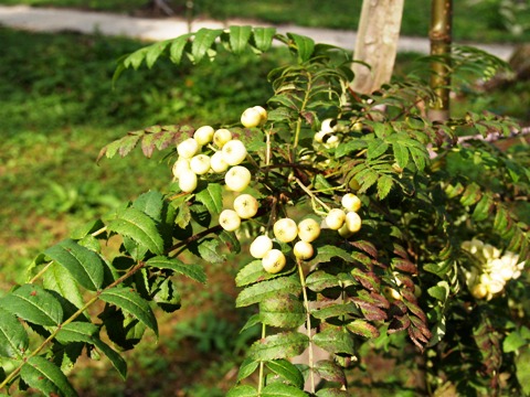 Рябина White Swan - невысокое дерево с ажурной, изреженой яйцевидной кроной, до 6 м. в высоту при 2,5 м. в диаметре. Листья перистые, зубчатые, чередующиеся, чуть меньше чем у рябины обыкновенной, темно-зеленого цвета, осенью красно-оранжевые. Цветет в конце мая белыми цветками в щитках,позднее появляются круглые плоды белого цвета с красным черенком,очень горькие. К почвам нетребователен,не переносит засуху,морозостойкий сорт.