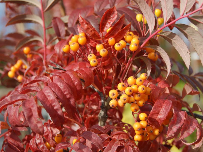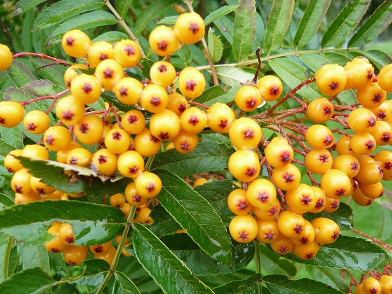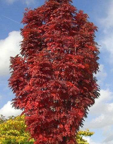 Рябина обыкновенная Фланрок (Отем Спайр) - дерево или кустовая форма рябины до 10 метров высотой. Растет умеренно быстро. Листья как у рябины обыкновенной, осенью окрашиваются в красно-оранжевые цвета. Плоды в стадии зрелости оранжево-желтого цвета. Максимальная декоративность растения достигается в осенний период.