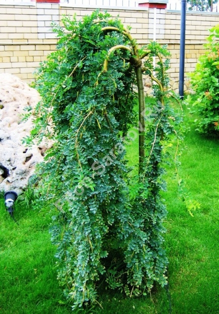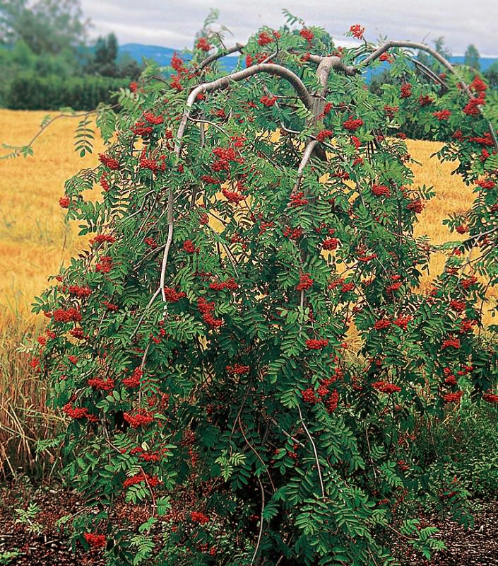 Это обыкновенная рябина, но с ниспадающими ветвями. В природе рябины имеют кудрявую крону - ветви приподнимаются. Прививка на высоте 1.8м даёт возможность получить у дерева кардинально другую форму кроны - с ниспадающими плакучими ветвями. Результат весьма привлекательный - дерево не вырастает большим как в природе, не выше 2-3м и ниспадающие ветви с красиво разрезанной листвой очень украшают сад. По всем остальным качествам плакучая рябина обыкновенная, т.е. цветёт кремовыми крупными шапками, потом к осени даёт оранжево-красные плоды. Рябина обыкновенная с прививкой очень пластична. По своему желанию Вы можете отгибать ветви в нужном направлении, подстригать, стричь вершину и прочее. Главное - это не подстригать слишком много сразу, дерево может ослабнуть.Зимуют без укрытия.