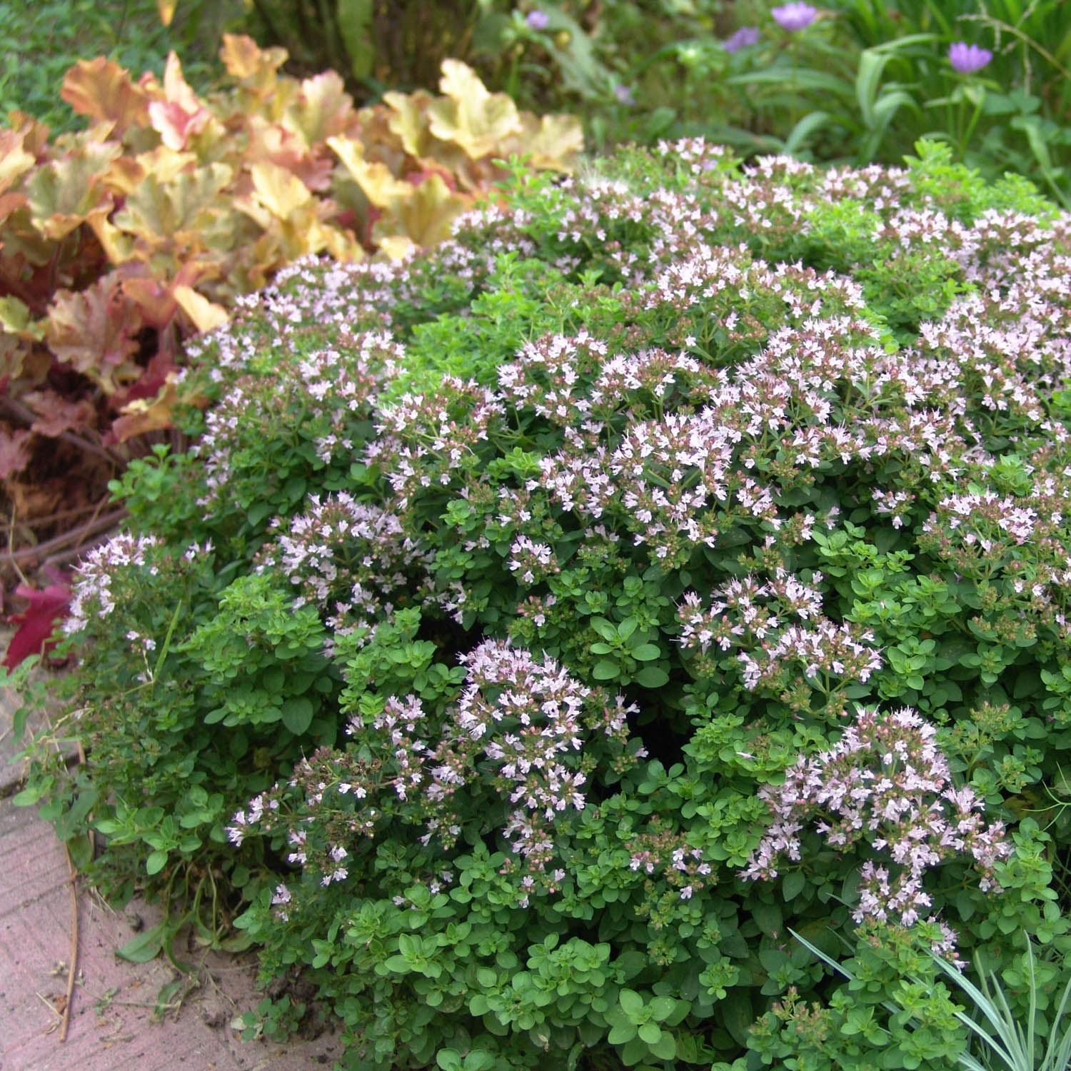 Душица обыкновенная Диаболо цветет в июле-сентябре. Хорошая устойчивость к засухе и вредителям.