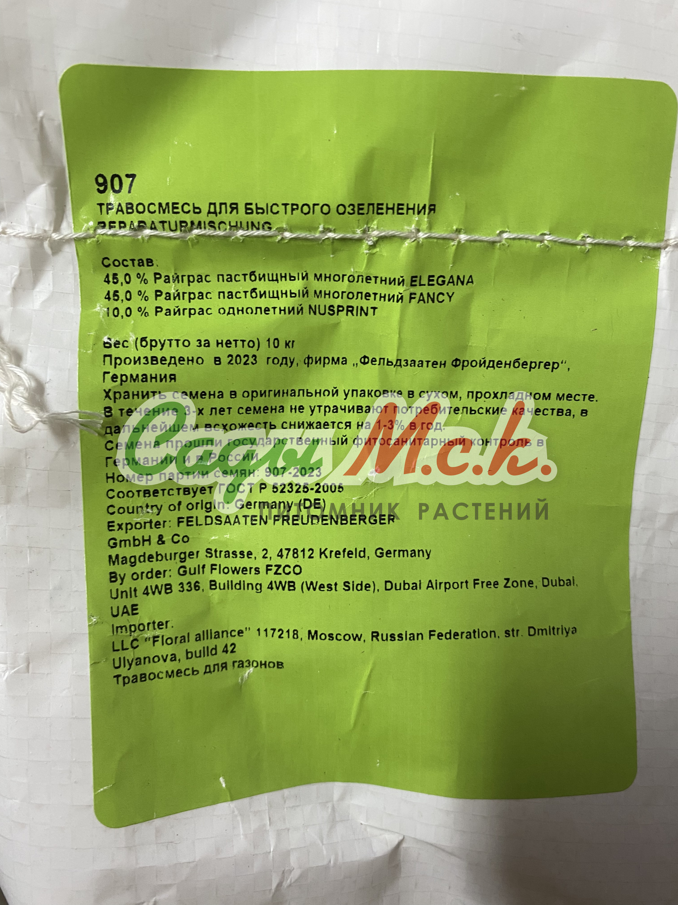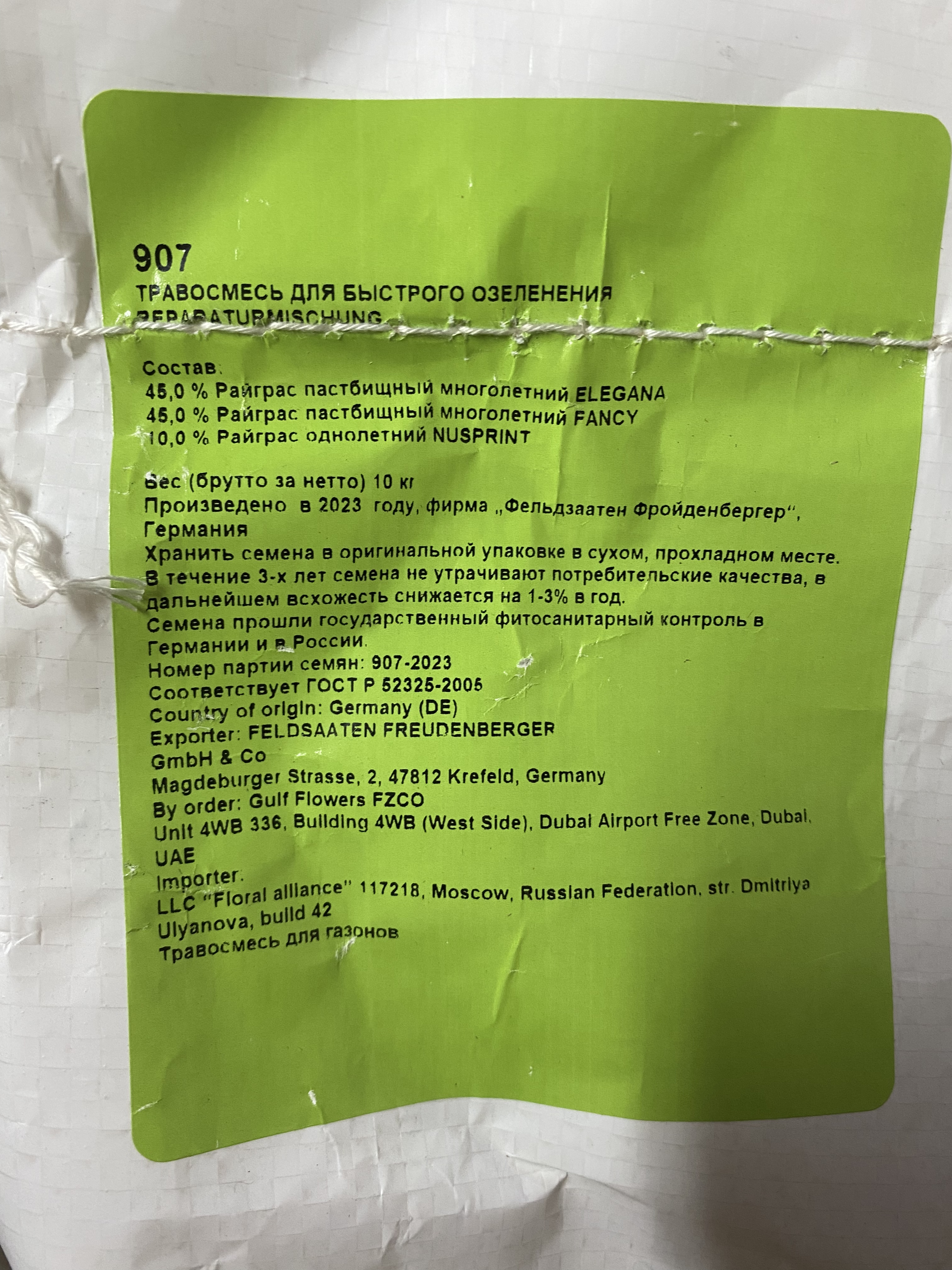 Состав: 45% Райграс пастбищный многолетний ELEGANA, 45% Райграс пастбищный многолетний FANCY, 10% Райграс пастбищный однолетний NUSPRINT. Производитель: Фельдзаатен Фройденбергер (FELDSAATEN FREUDENBERGER). Страна: Германия. Дата производства: 2023 г.