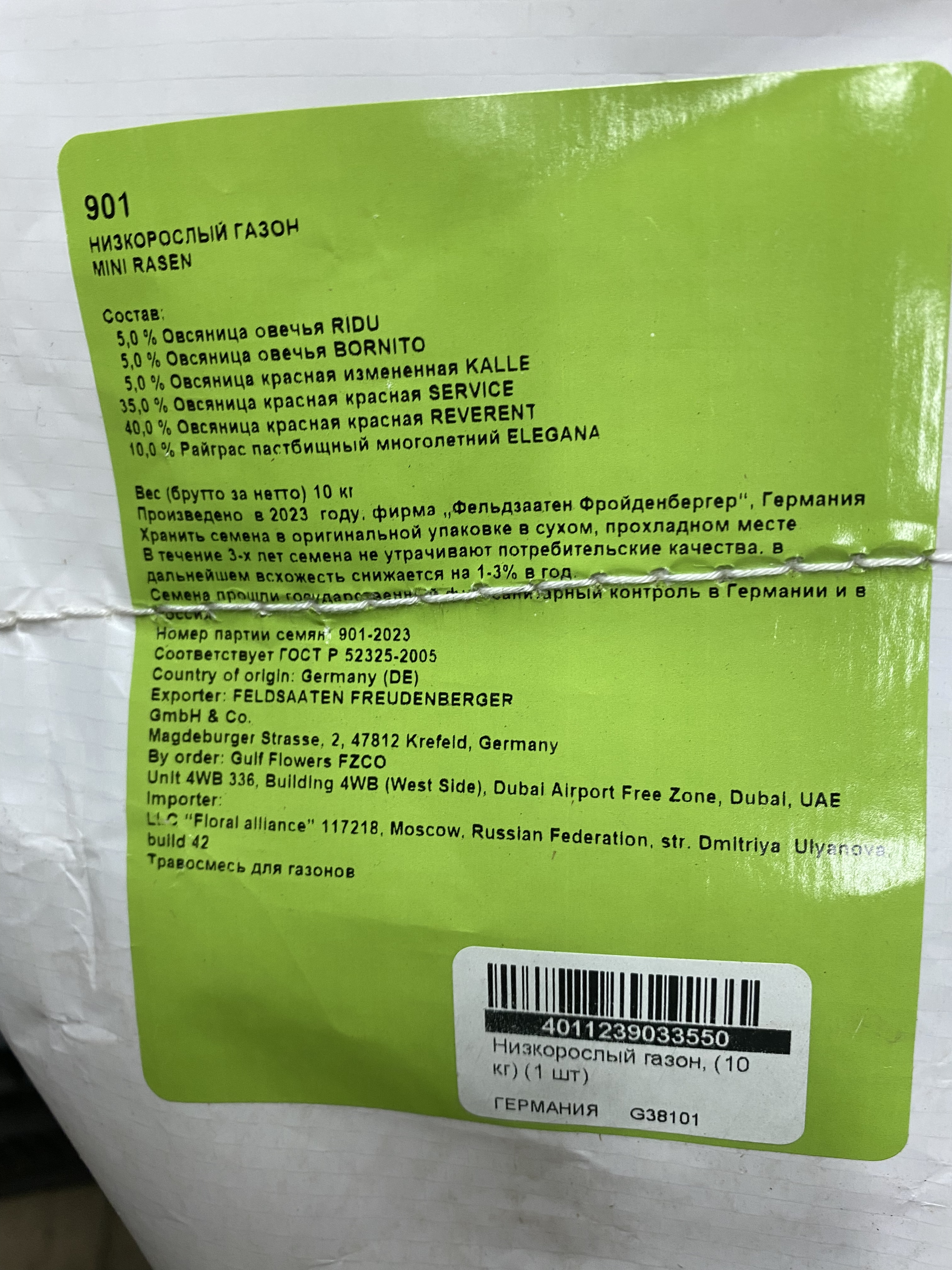 Состав: 5% Овсяница овечья RIDU, 5% Овсяница овечья BORNITO, 5% Овсяница красная измененная KALLE, 35% Овсяница красная измененная SERVICE, 40% Овсяница красная REVERENT, 10% Райграс пастбищный многолетний ELEGANA. Производитель: Фельдзаатен Фройденбергер (FELDSAATEN FREUDENBERGER). Страна: Германия. Дата производства: 2023 г.
