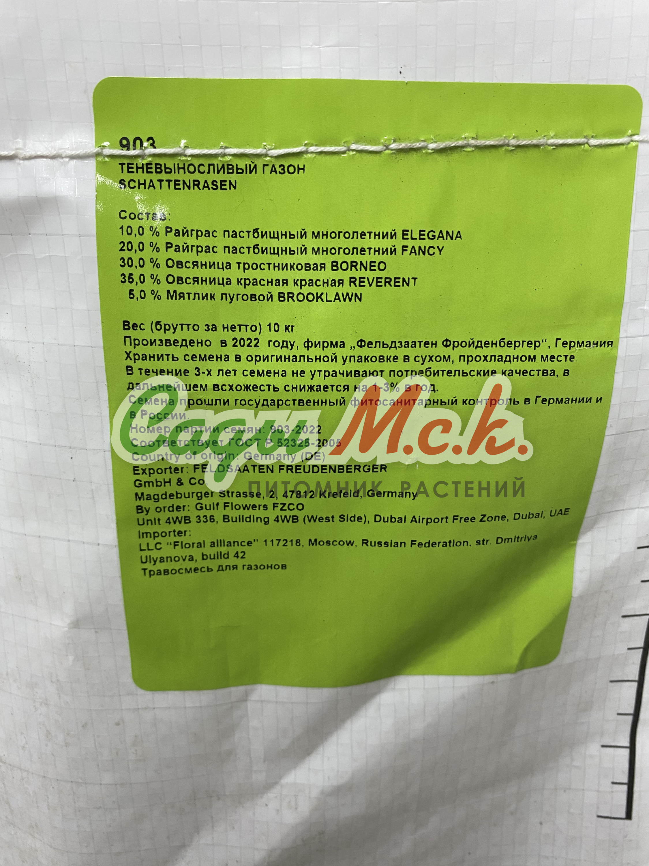 Состав: 10% Райграс пастбищный многолетний ELEGANA, 20% Райграс пастбищный многолетний FANCY, 30% Овсяница тростниковая BORNEO, 35% Овсяница красная REVERENT, 5% Мятлик луговой BROOKLAWN. Производитель: Фельдзаатен Фройденбергер (FELDSAATEN FREUDENBERGER). Страна: Германия. Дата производства: 2022 г.