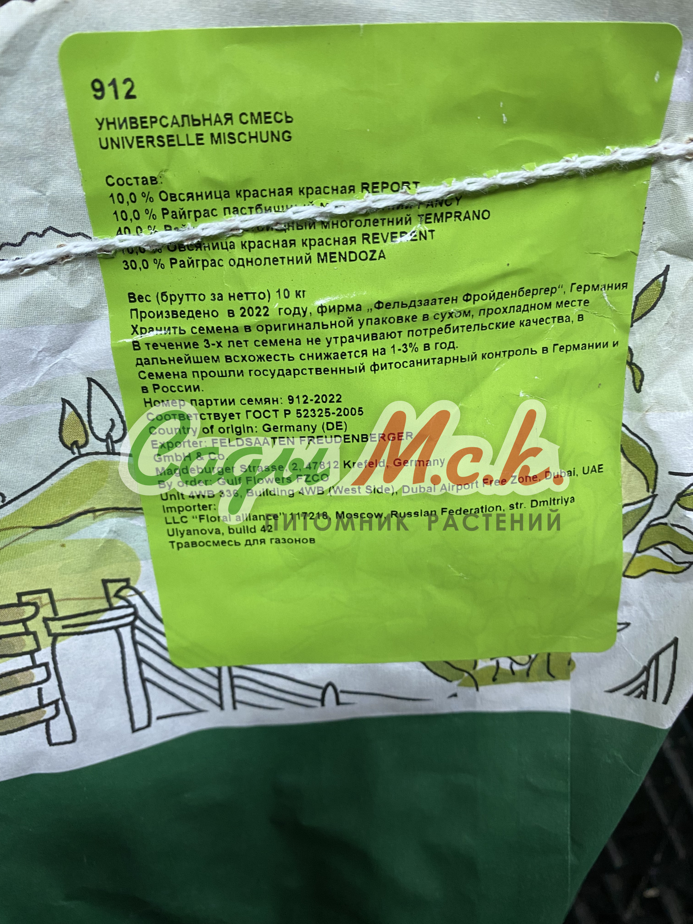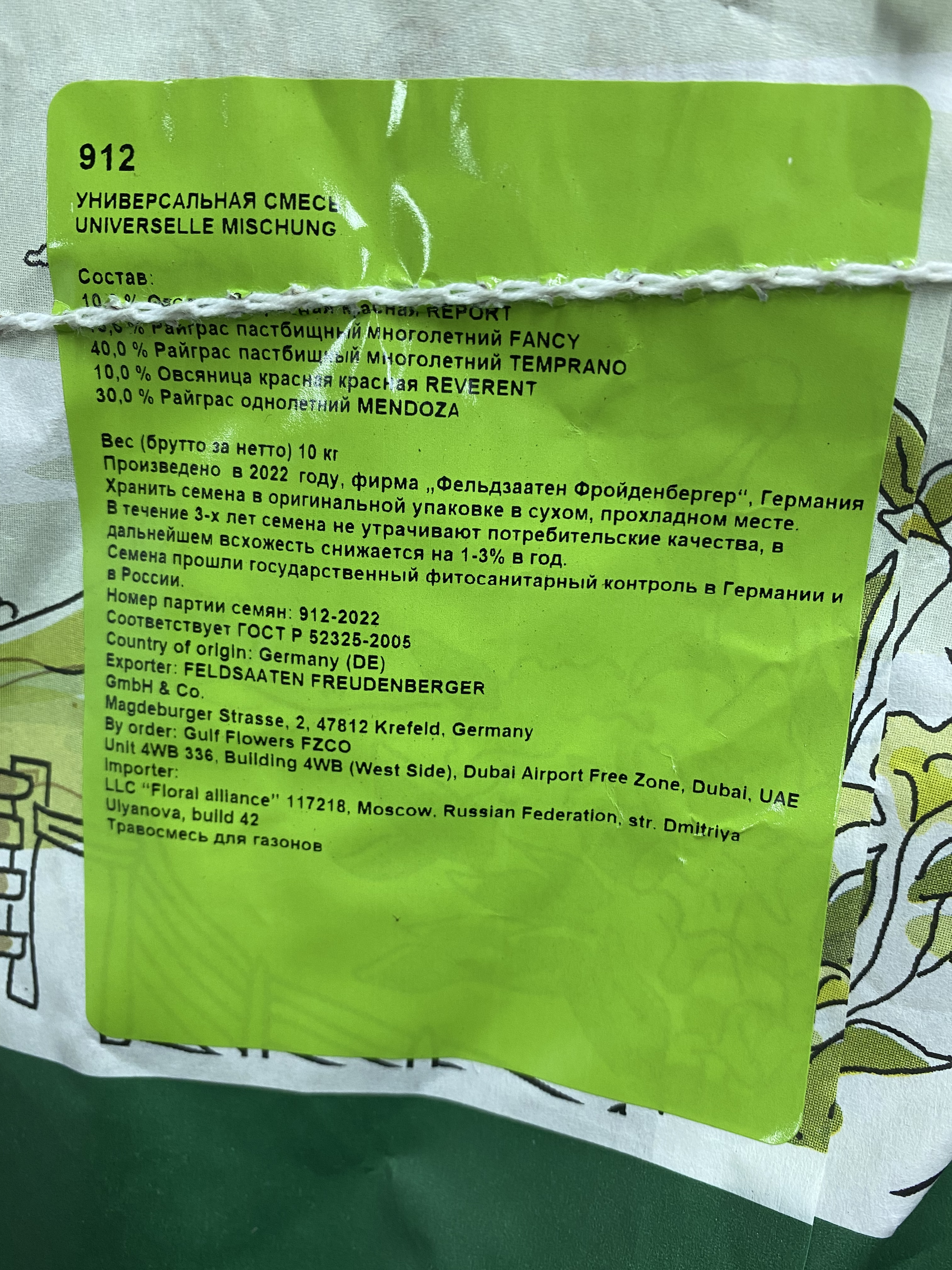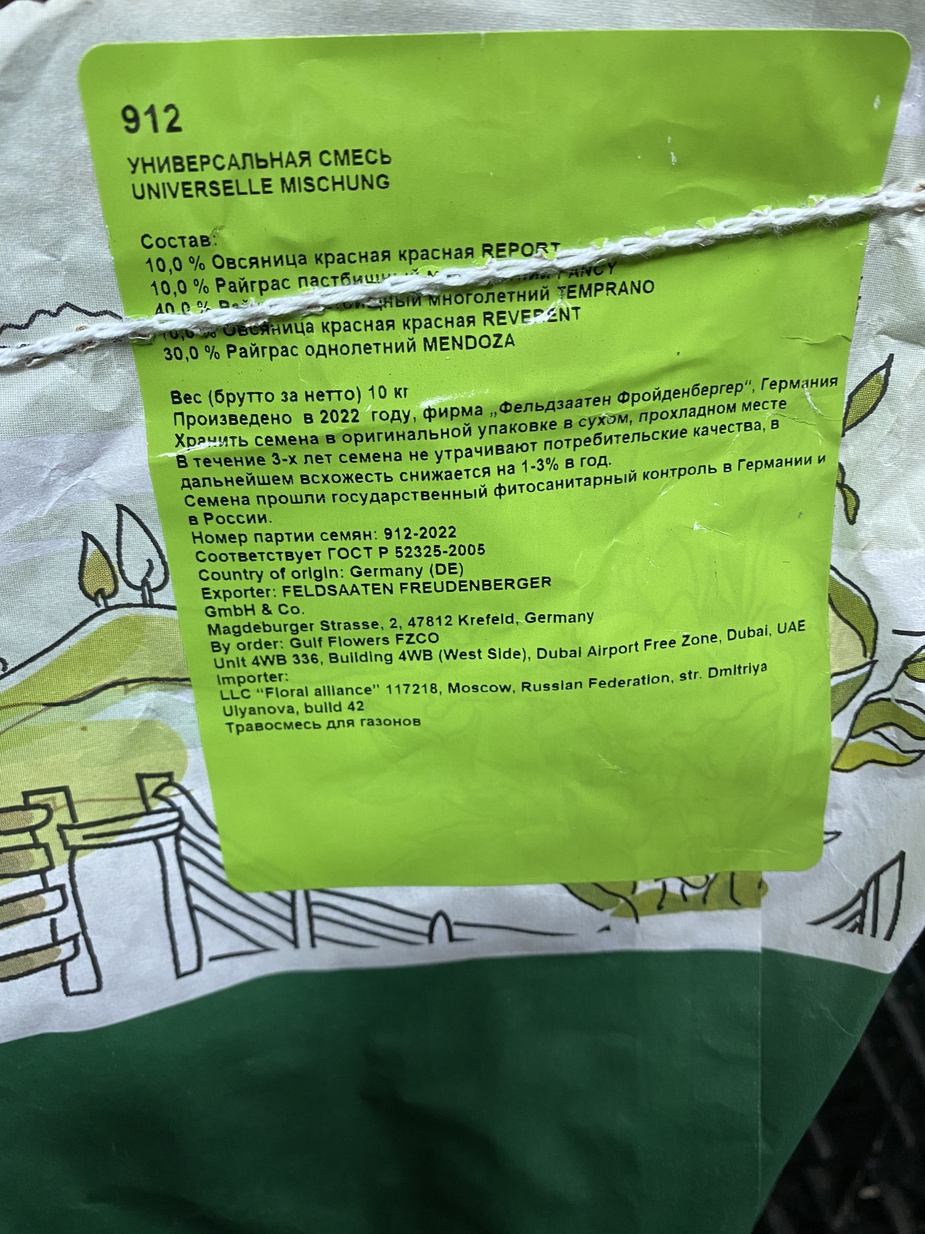 Состав: 10% Овсяница красная REPORT, 10% Райграс пастбищный многолетний FANCY, 40% Райграс пастбищный многолетний TEMPRANO, 10% Овсяница красная REVERENT, 30% Райграс однолетний MENDOZA. Производитель: Фельдзаатен Фройденбергер (FELDSAATEN FREUDENBERGER). Страна: Германия. Дата производства: 2022 г.