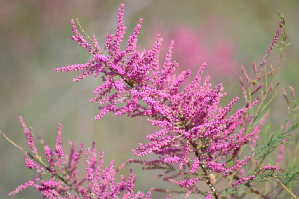 Ветвистый тамарикс преимущественно произрастает на берегах отмелей, озер и рек. Представляет собой компактный кустарник, кора которого имеет сизый или зеленый окрас, листья узкие шиловидной формы. Цветки формируются розового окраса, продолжительность цветения составляет не менее 3-4 месяцев, начиная с июня. Высота достигает до 2 м в высоту.