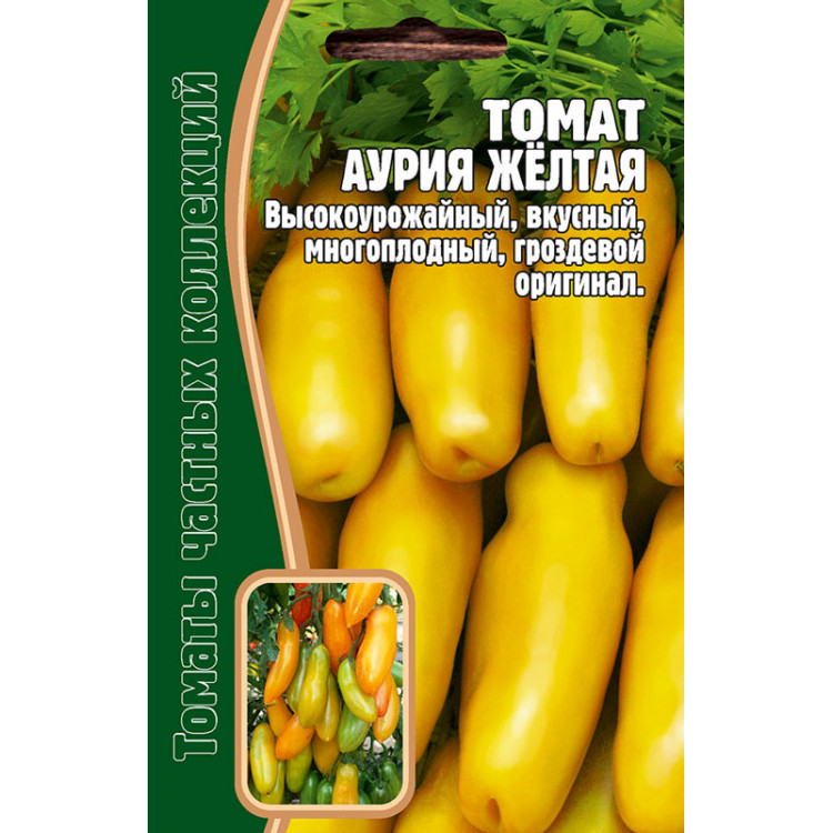 Томат Аурия жёлтая., индетерминантный сорт, который порадует вас обилием неоново-жёлтых плодов редкой банановидной экзотической формой. Урожайность этого сорта вдвое больше чем у других томатов. В кисти формируется до 9 томатов, длиной до 15 см. Плоды плотные, гладкие, малосемянные, золотисто-медовые, массой 150 –200 г. Этот сорт хорошо растёт как в теплицах, так и в открытом грунте.
