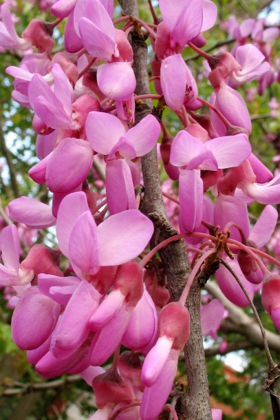 Церцис европейский или Иудино дерево – кустарник, цветущий в апреле-мае ярко-розовыми цветками, которые собраны в своеобразные пучки. В высоту он может достигать 7-10 метров.