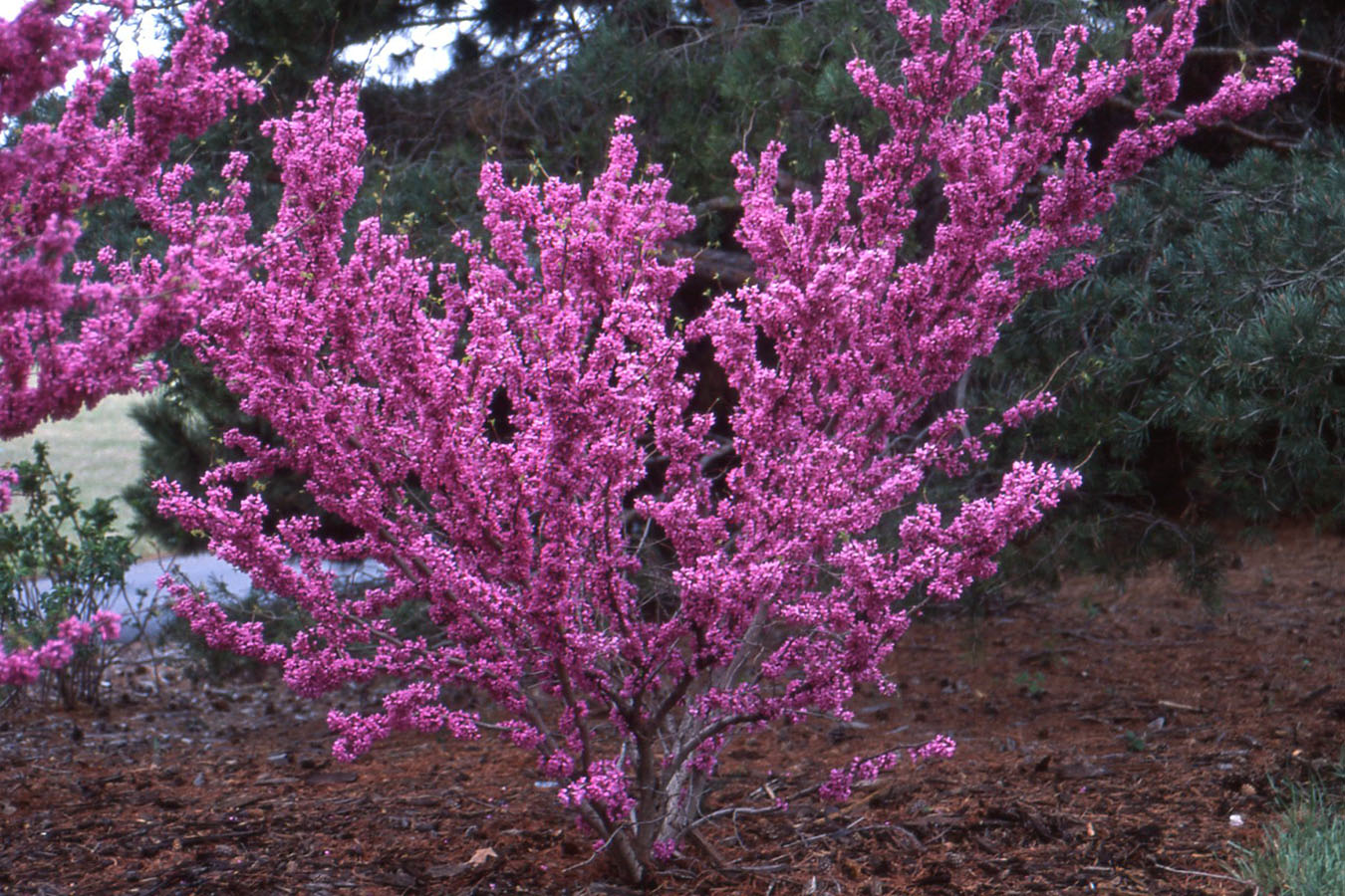 Очень декоративное, маленькое, чаще многоствольное деревце высотой и шириной 3-3,5 м. Крона широкая вазообразная. Листья округлые, сердцевидные у основания, диаметром 8-12 см, тёмно-зелёные блестящие, осенью - жёлтые. Цветки тёмно-пурпурно-розовые, в гроздевидных соцветиях. Цветение обильное, в мае, до распускания листьев. Плоды – коричневые плоские стручки. Место солнечное, тихое, защищённое от ветра. Почва плодородная, умеренно влажная. Рекомендуется для выращивания в тёплом климате и в молодом возрасте требует укрытия на зиму. Зона 6 (до -18ºС)