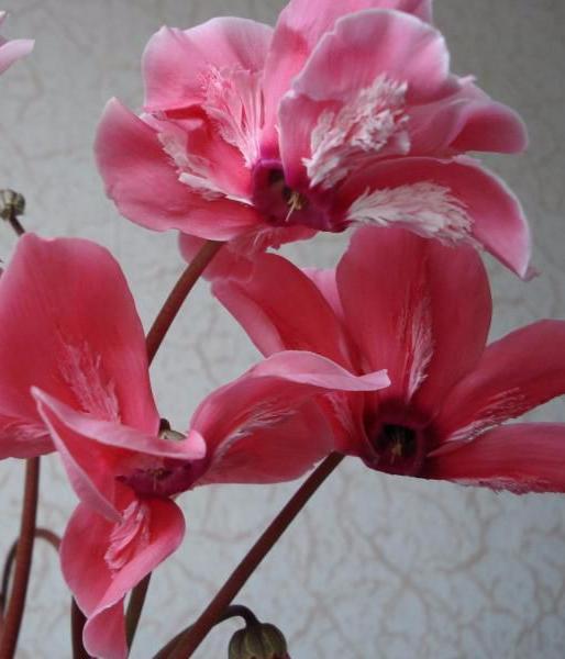 Цикламен персидский Барбаросса - Многолетнее клубневое растение семейства Первоцветные. Цветки крупные, оригинальной красно-белой окраски, очень ароматные, цветонос достигает длины 15 -20 см. Цветет с поздней осени до конца апреля, летом находится в состоянии покоя. Оптимальный срок посева конец августа. Семена перед посевом замачивают на сутки в теплой воде, а затем высевают в горшки с листовой и торфяной землей(1:1).Сверху семена присыпают слоем земли 0,5-1см, обильно поливают, накрывают темной пленкой. При t 20 °C всходы появляются через 30-40 дней. После появления всходов притенение снимают, температуру снижают до 15-17 °C. Когда образуются маленькие клубеньки с двумя листочками, пикируют в ящики со смесью из листовой, торфяной земли и песка (2:1:0,5). При пересадках у молодых растений верх клубенька должен находиться у самой поверхности почвы (не глубже 0,5 см). У взрослых растений верх клубня обычно открыт. В период покоя сбрасывает листья. Выращивают на северных и восточных окнах, на южном притеняют от прямых солнечных лучей. Зимой содержат на светлом месте при температуре не выше 8 - 10 градусов. Летом необходимо выполнять приемы по поддержке роста растений: поливать исключительно через поддон, опрыскивать водой комнатной температуры, удобрять. Удобряют не более 2-3 раз за лето, преимущественно азотно-калийными удобрениями.