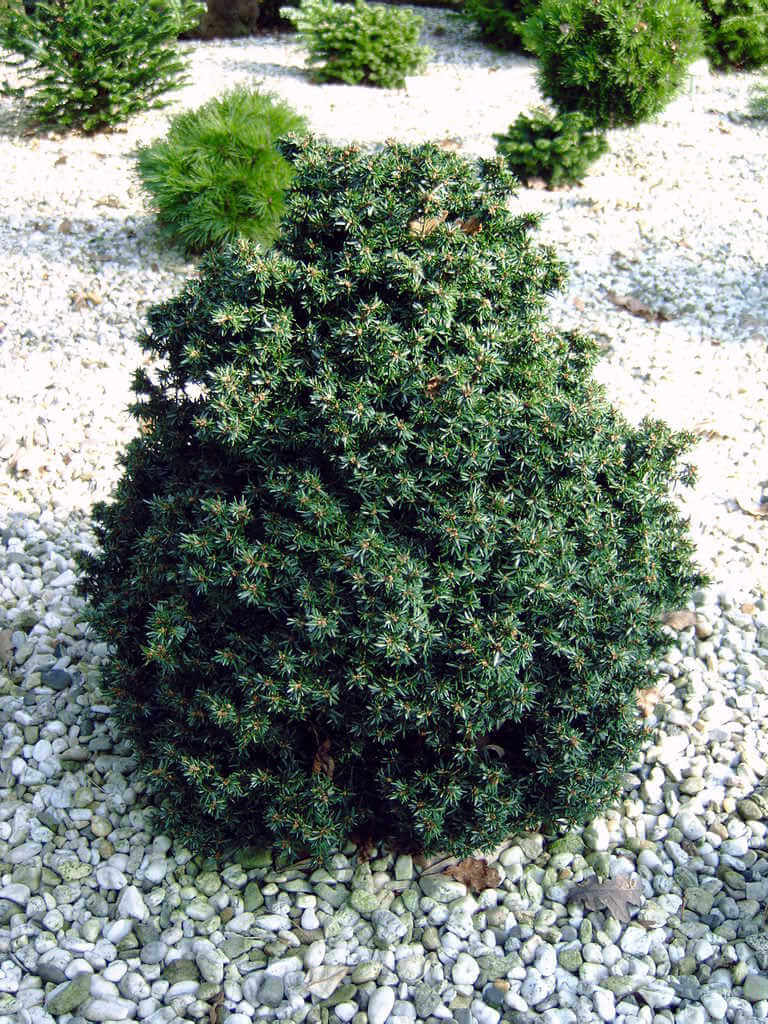 Тсуга Мinuta - карликовый сорт. Форма, близкая к сферической, нерегулярная с очень плотным ветвлением. Иглы 6-10 ? 1-1,5 мм длиной , темно-зеленые с 2 белыми полосами с изнанки. Размер до 50 см. Прирост в год 1-1,5 см в год.