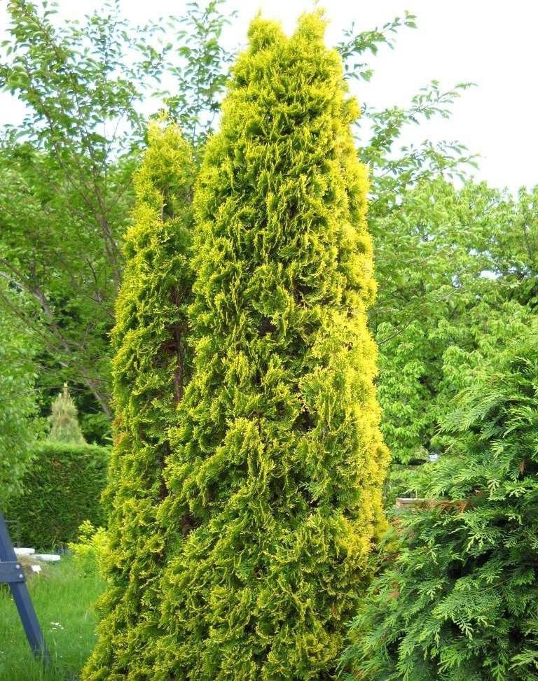 Узкая острая желто-хвойная туя высотой до 10 м. и диаметром кроны до 1,8 м. Дерево растет довольно быстро, ежегодно прибавляя до 30 см высоты. Имеет прямой, ровный и стройный ствол, к которому плотно прижимаются скелетные ветви, образуя красивую устремленную вверх общую форму дерева.Скелетные ветки короткие и мощные, тесно прижимаются друг к другу, а на концах начинают сильно ветвиться. За счет такого строение крона выглядит очень густой и плотной, формируется симметрично. Хвоя густая, яркая, золотисто-жёлтая, не подгорает на солнце, зимой приобретает бронзовый оттенок. Хорошо себя чувствует как на солнце, так и в полутени. На солнце не горит.
