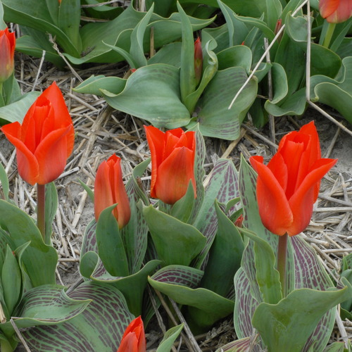 Тюльпан Ориентал Бьюти - карликовый сорт. Стебель очень низкий, средней высотой 15 см, зеленой окраски с бордовым оттенком у основания цветка. Листья зеленые, толстые. Цветки красно-оранжевые, бокаловидной формы.