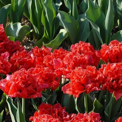 Тюльпан Anfield - цветок сильно махровый, ярко-красный, похож на гвоздику. Длина стебля 20 см. Лепетски бартахтные. Листья длиные, иногда могут превышать высоту побегов.