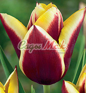 Тюльпан триумф Флэминг Флаг - красивый, яркий сорт. Длина стебля 25 см. Листья длинные, зеленые, с темными штрихами по всей длине листа. Цветок яркий, с заостренными кончиками лепестков. Цветет в мае.