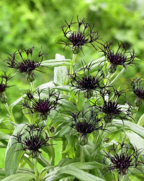 с редким серебристым опушенем. Экзотические цветы, с шелковистыми, фиолетово-чёрными, тонко разрезанными лепестками выглядят на клумбе как инопланетные пришельцы. Васильки быстро разрастаются на открытом солнце, формируя