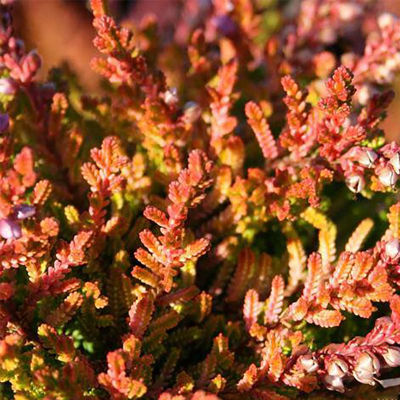 Вереск обыкновенный (Calluna vulgaris) Zora - вечнозеленый вертикальный кустарник с декоративной окраской листвы, не цветет. Размер: Достигает 30-40 см в высоту. Листья: супротивные, оранжево-желтые летом, красно-оранжевые зимой.