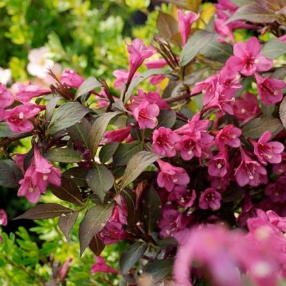 Вейгела Rubidol - Сорт довольно новый, ещё не распространён в нашем регионе, но это примечательно, потому что он выделяется с множеством интересных функций. Вейгела florida Rubidor вырастает до около 2 метров в высоту и имеет аналогичную ширину, так как его боковые побеги, как правило разрастаются в ширь образует компактный, плотный куст. Листья овальные, довольно большие, по краям зазубренные с тонкий фиолетовый оттенком. Цветёт в конце мая и начале июня. Цветы темно-розовый, слегка блестящие, до 3 см в диаметре, колокольчатые. Соцветия собранные в небольшие метелки, состоящих из 7-10 цветков. Цветение очень обильное. Вейгела Rubidol - украшает коллекции практически всех ботанических садов, дендропарков и очень красивых усадьб. В период цветения Вейгела Rubidol это роскошь и красота вашего сада, цветков так много, что практически не видно листвы на кусте, куст как бы сплошное цветение.Как и большинство вейгел данный сорт неприхотлив выращивании. Вейгела Рубидол прекрасно формируется в нужной высоте, ширине и форме куста обрезкой, и чем регулярнее обрезка тем более пышное цветение вы будете иметь у себя в саду