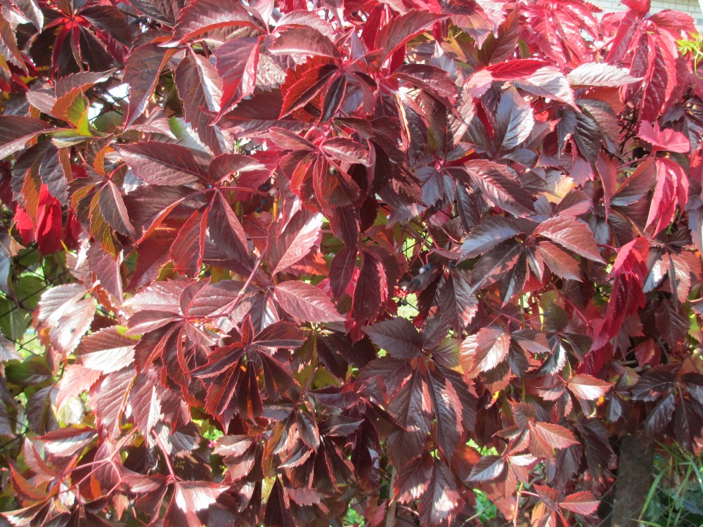Виноград девичий пурпурный – эффектная разновидность листопадной лианы с ярко-красными листьями. Сорт способен вырастать в высоту до 20-30 м, цепляясь при помощи присосок на концах усиков за вертикальную поверхность, поэтому широко используется для озеленения придомовых территорий и построек. Небольшие круглые плоды несъедобны, но выглядят достаточно красиво.