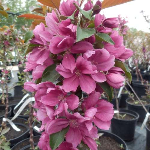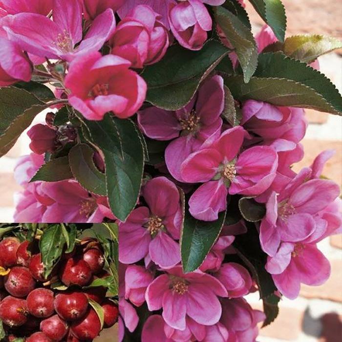 Саженцы яблони декоративной колоновидной Манящий аромат привлекают к себе внимание многих садоводов. В первую очередь нужно отметить, что они образуют сильную колонну и имеют декоративное предназначение. Яблоня цветет в средние сроки, формируя на своих ветвях крупные соцветия лилового цвета. У этого сорта отсутствует оголение и боковые ветви. Дополняют композицию блестящие темно-зеленые листья с буроватым оттенком. Небольшие плоды малинового цвета имеют слегка вытянутую форму, на вкус они кисло-сладки, слегка вяжут. Главное преимущество этого крупномера заключается в том, что оно обильно плодоносит.