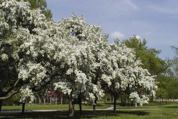 Саженцы яблони декоративной Профессор Шпренгерм привлекают к себе внимание весной эффектными белоснежными соцветиями. Данный сорт очень обильно плодоносит, его яблоки могут храниться всю зиму и при этом не испортиться. В среднем высота дерева составляет четырех с половиной метров, Красивая пышная крона в период цветения усыпана розовыми бутонами, которые, распускаясь, становятся белыми. Соцветия данного крупномера очень ароматные, плоды насыщенного яркого красного цвета долго не опадают с дерева. Этот сорт отличается своей морозоустойчивостью, поэтому зачастую его выбирают садоводы средней полосы нашей страны.